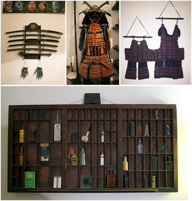 2. Armor of Feudal Japan. “In stark contrast to what the nobles/officers of the Samurai would have worn (top center,) this is essentially foot soldiers armor (top right.) It’s made to roll up. I imagine the story: a farmer on the feudal lands, the samurai call to arms. He wouldn’t have had a sword, just a hat and this armor. It’s had many repairs… I love seeing battle-used stuff.”